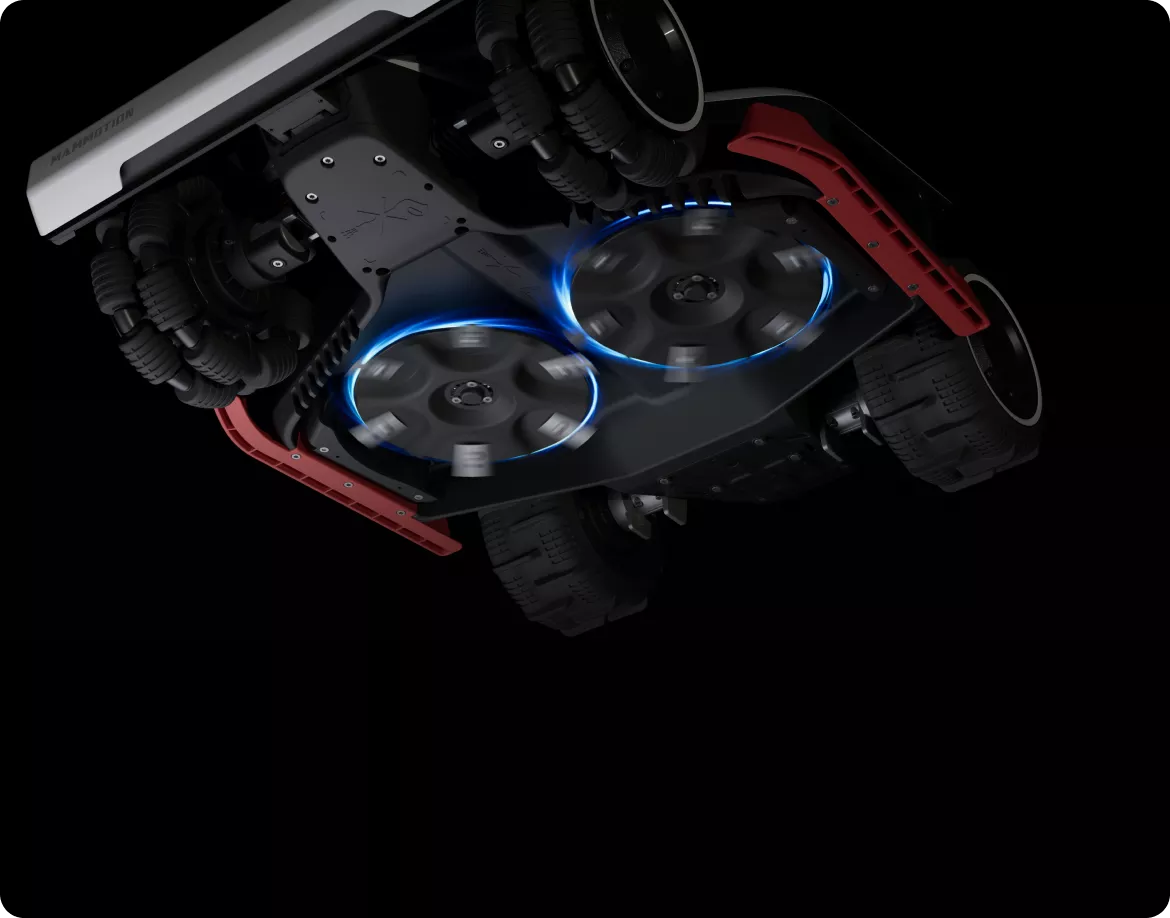 Dos motores de alto par de 165 W con discos de 6 cuchillas trabajan con la Visión AI del robot cortacésped inteligente LUBA 3 AWD para ajustar automáticamente velocidad y potencia según la densidad del césped, maximizando el rendimiento de corte y la eficiencia energética.