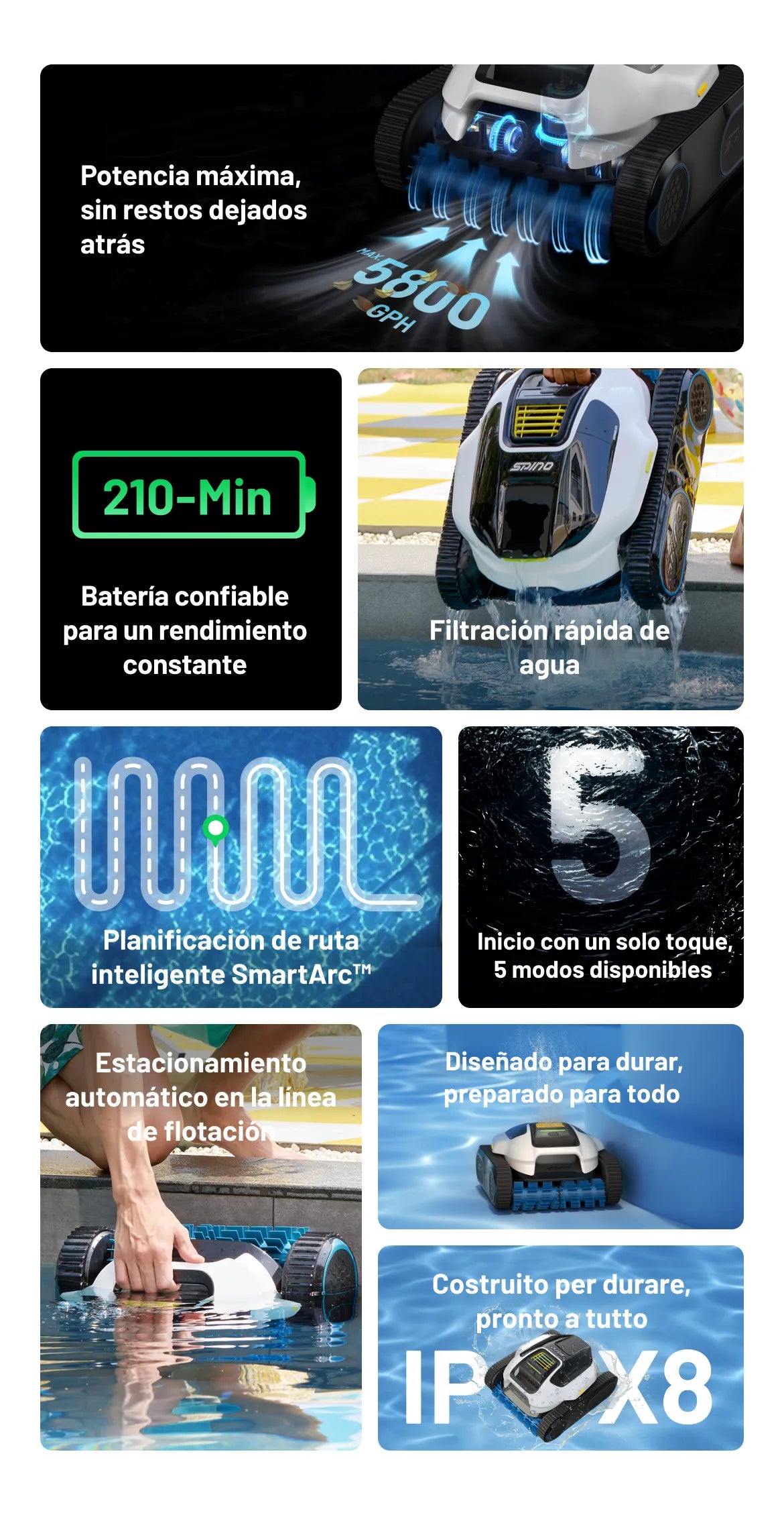 Succión de 5800 GPH para una limpieza intensiva (activar después de los modos de Piso/Pared, exclusivo para la aplicación).